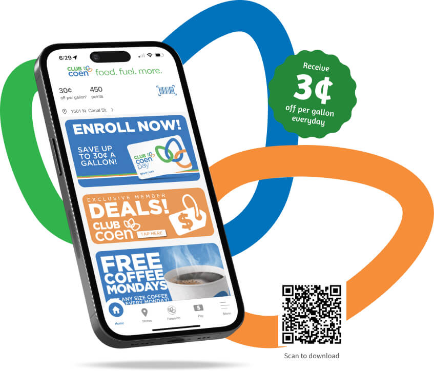 All Club Coen members receive special discounts both at the pump and in store everyday. Members earn points by fueling up outside, or picking up some favorites inside, and then use their points to get access to major savings.